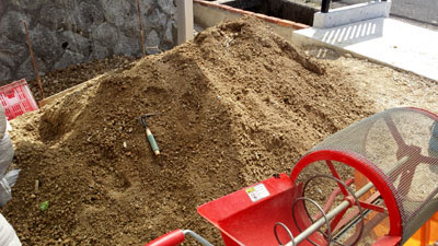 土を仕分ける。ゴロゴロ土を投入した(pH調整用の粉末硫黄も混ぜている)。